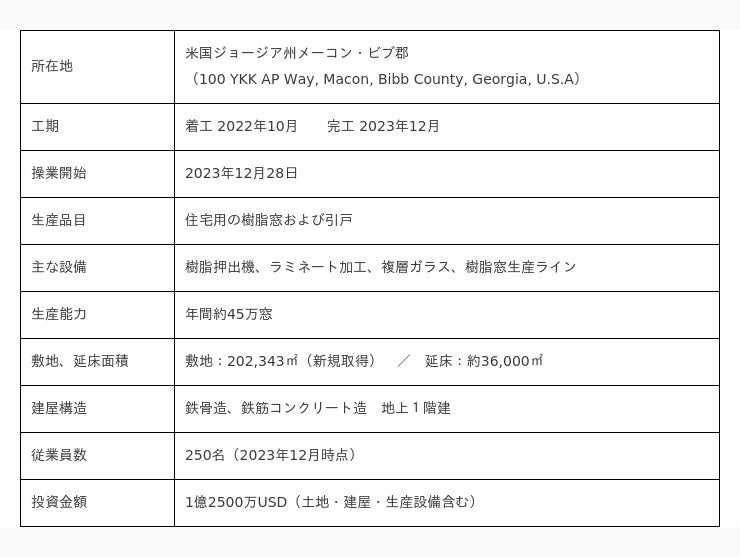 YKK AP株式会社の現地法人であるYKK APアメリカ社(本社:米国ジョージア州、社長:Oliver Stepe)は、ジョージア州メーコン・ビブ郡に建設を進めておりました住宅用樹脂窓を製造する新工場「メーコン工場」が2023年12月に完成し、12月28日に操業を開始したことをお知らせいたします。