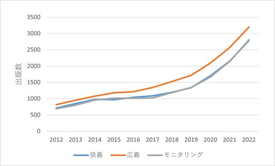 広義領域の2021年出願数は2015年出願数の約1.4倍であるのに対し、狭義領域は約2.4倍、モニタリング領域は約3.4倍と大幅に増加しており、狭義領域およびモニタリング領域は2015年以降、社会実装が進んでいるといえます。