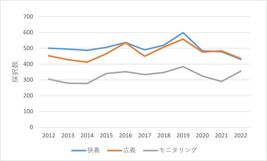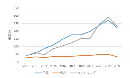 広義領域の出願数と比較すると、狭義領域およびモニタリング領域の出願数が多く、相対的には普及が進んでいるといえます。しかし、出願数自体がそもそも多くないので、社会実装に移行しつつあるタイミングともいえます。逆に広義領域は、狭義領域やモニタリング領域と比較すると、社会実装の時期はまだ先であると読みとれます。