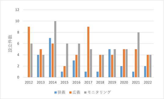 スタートアップ企業はあたらしい技術で社会に影響をあたえる企業であり、特許と同様、近未来における社会実装の指標といえます。図3は、2012年以降に設立された3つのネイチャーポジティブ分類の領域別スタートアップ企業の設立件数推移です。