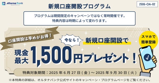個人投資家の皆様に多様な投資機会を提供するオルタナティブ投資プラットフォーム「オルタナバンク」を運営するSAMURAI証券株式会社(本社:東京都港区、代表取締役社長:山口 慶一)は、2025年3月28日(金)より常時開催している「新規口座開設プログラム」につきまして、2025年6月27日(金)より新たな特典内容にて実施いたします。