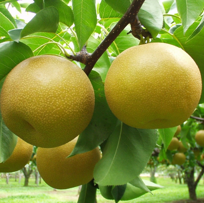 福島の代表品種である豊水梨(左)と甘味の強さが特徴の白桃系桃(右)