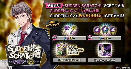 イベント期間中、KILLER SCRATCH!!をプレイするとライズ消費量に応じた確率でSUDDEN SCRATCH!!が発生します。SUDDEN SCRATCH!!をプレイすると、通常の報酬アイテムの他、限定アイテム「SUDDENコイン」を獲得することができます。「SUDDENコイン」を集めることで、レイズキーやナゴヤ・ディビジョンのデコステッカーに使えるブースターなどと交換することが可能です。他にも、ストーリーカードの【Live it up】シリーズ、「A.R.B remix」楽曲などがラインナップされています。詳細はアプリ内お知らせをご確認ください。