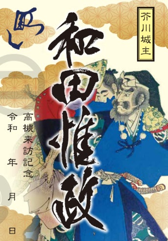 今回新たに発売する武将印は、「芥川城主和田惟政」と「高槻城主和田惟政」の2種類でいずれも縦15センチメートル、横10.5センチメートル。幕末に描かれた勇ましい姿の惟政の錦絵「太平記英雄伝」と、明治時代に描かれた足利義昭を背負った惟政の錦絵「新撰太閤記」という異なるデザインの錦絵と惟政の花押(サイン)が配置。2枚を並べると惟政と関わりがあった、足利義昭の家紋「二つ引両」と織田信長の家紋「織田木瓜」がつながるデザインになっています。各500枚限定。ぜひ、この機会にお買い求めください。
