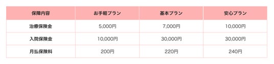 月額型は「お手軽プラン」「基本プラン」「安心プラン」の3種類で提供。期間選択型は1プラン(保険金額は月額型の安心プランと同等)。ユーザーのニーズに応じた幅広いプランを用意しています。