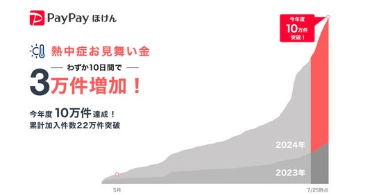 LINEヤフー株式会社(以下、LINEヤフー)のグループ会社であるPayPay保険サービス株式会社(以下、PayPay保険サービス)とZフィナンシャル株式会社、PayPay株式会社(以下、PayPay)は、キャッシュレス決済サービス「PayPay」内の「PayPayほけん」ミニアプリ(※1)において、2024年4月22日より提供を再開した「熱中症お見舞い金」(以下、本保険)の今年度の加入件数が、サービス提供開始以降最速で10万件を突破しました(※2)。