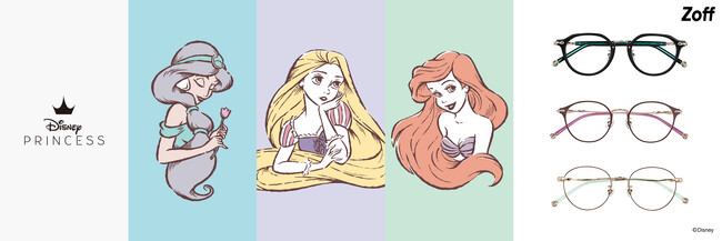 ディズニー映画『アラジン』のジャスミン、『塔の上のラプンツェル』のラプンツェル、『リトル・マーメイド』のアリエルが登場。2023年10月6日(金)に全国のZoff店舗、公式オンラインストア他で発売