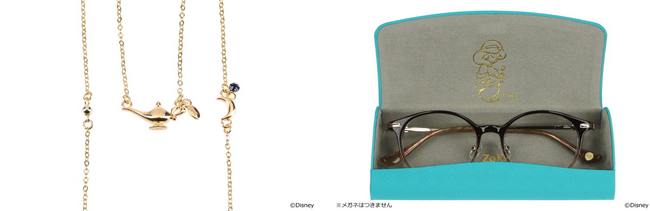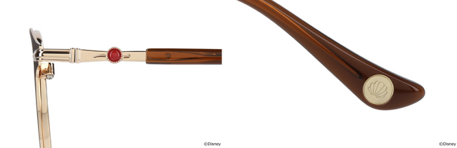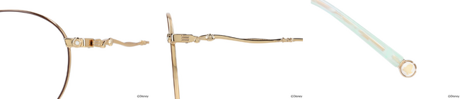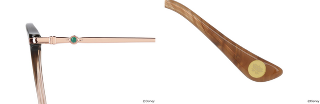学校や職場でもかけやすいプラスチックのボストン型で、プリンセスらしいフェミニンなデザイン。サイドに、ジャスミンの衣装をイメージしたターコイズカラーの七宝がさりげなく華やかさを添えます。テンプル先の内側には、「蓮の花」の埋め込みパーツが。
