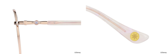 サイドに、ラプンツェルの衣装をイメージしたパープルカラーの七宝をのせたリボンのようなデザインがちらり。テンプル(つる)先の内側には、ラプンツェルが生まれた王国の紋章「太陽のマーク」の埋め込みパーツが。