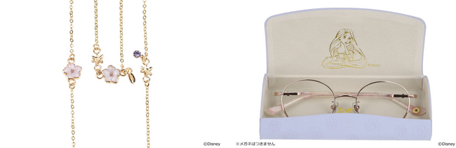ラプンツェルの金色に輝く長い髪をイメージ。テンプル(つる)で美しい髪を表現し、ラプンツェルの花飾りをイメージしたメタルパーツを添えました。パープルカラーのラインストーンもあしらった高級感ある一本です。