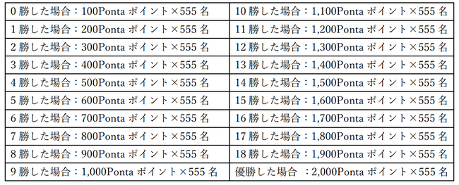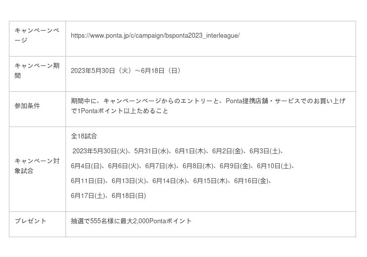 キャンペーン期間中、キャンペーンページからのエントリー、およびPonta提携店舗・サービスでのお買い上げで1Pontaポイント以上ためていただいた方の中から、抽選で555名様に最大2,000Pontaポイントをプレゼントします。お一人様当たりの当選ポイント数は、セ・パ交流戦でのオリックス・バファローズの勝ち数に応じて増加します。0勝の場合の当選ポイント数は100Pontaポイント、1勝するごとに100Pontaポイント増加し、全18試合を全勝(18勝)すると1,900Pontaポイントとなります。優勝した場合には、勝ち数に関係なく2,000Pontaポイントをプレゼントします。交流戦の期間中、試合結果に応じた当選ポイント数の増加状況は、バファローズ☆ポンタ公式Twitter(@bs_ponta https://twitter.com/bs_ponta/)にてお知らせします。