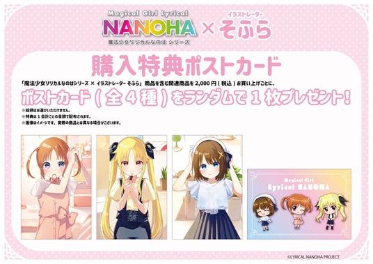 「魔法少女リリカルなのはシリーズ×イラストレーターそふら」商品を含む関連商品を1会計2,000円(税込)お買い上げごとに、購入特典としてポストカード(全4種)を1枚プレゼント。