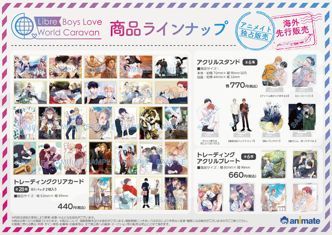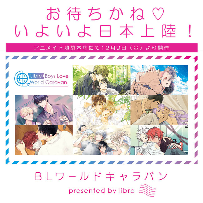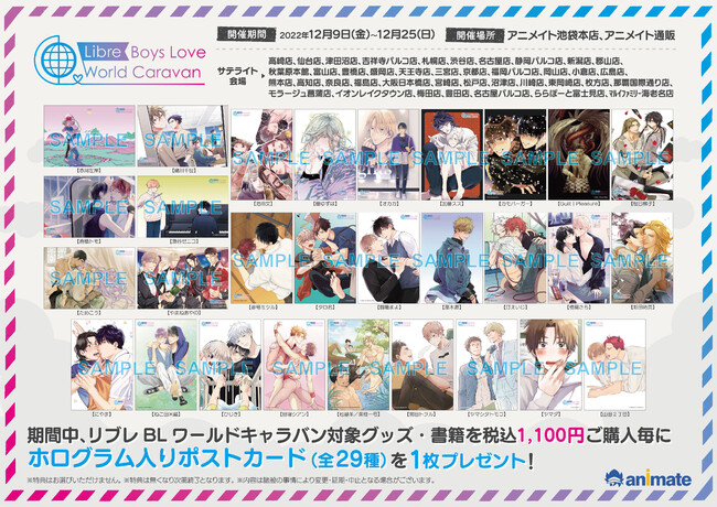 株式会社リブレ(本社:東京都新宿区、代表取締役社長:太田歳子)は、世界の都市を巡り開催されている「リブレBLワールドキャラバン」の日本での開催を、海外にも店舗を展開するアニメイトの「アニメイト池袋本店」ほか約40店舗にて2022年12月9日(金)より開催いたします。