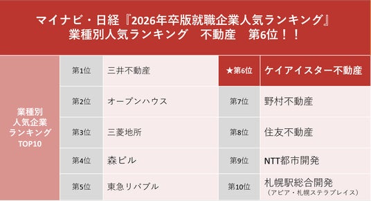 ケイアイスター不動産株式会社(本社/埼玉県本庄市、代表取締役社長/塙 圭二、以下「当社」)は、株式会社日本経済新聞社と株式会社マイナビが発表した「2026年卒版就職企業人気ランキング」において、「業種別人気企業ランキングTOP10<不動産>」の6位に選出されました。また、同特集の「地域別人気企業ランキングTOP30<関東甲信越(東京除く)>」では29位に選出されました。