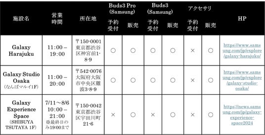 7月11日より、新製品をGalaxy世界最大級のショーケース「Galaxy Harajuku」(東京・原宿)、「Galaxy Studio Osaka」(大阪・難波/なんばマルイ1F)と、今回新設する特設会場「Galaxy Experience Space」(東京・渋谷)にて順次展示予定です。なお、「Galaxy Buds3 Pro」「Galaxy Buds3」の純正・専用アクセサリーは下記3つのショーケースすべてでご購入いただけます。是非この機会にご来店ください。
