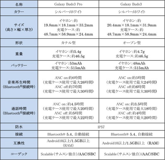 <主な仕様 : 「Galaxy Buds3 Pro」「Galaxy Buds3」>