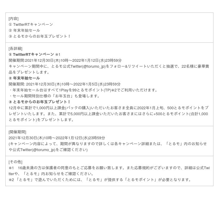 キャンペーン内容は第一弾:TwitterRTキャンペーン(期間:2021年12月30日10時~2022年1月12日)、第二弾:年末年始セール(期間:2021年12月30日10時~2022年1月12日)、第三弾:とるモからのお年玉プレゼント!(期間:2022年1月上旬~2022年1月末)の3点です。