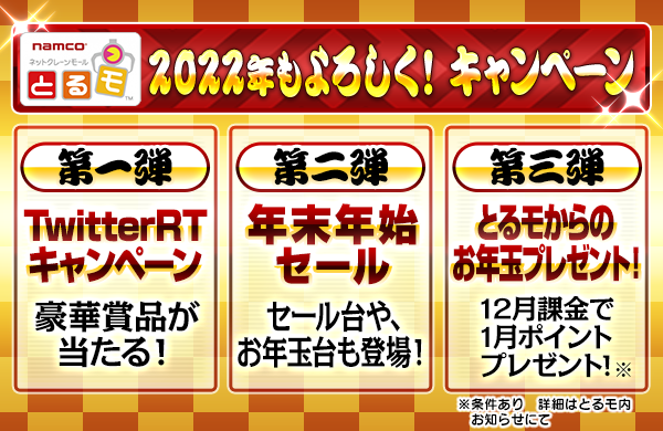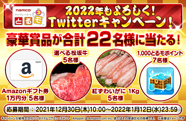 株式会社バンダイナムコアミューズメントが運営する、ネットクレーンモール「とるモ」は、2021年12月30日(木)より『2022年もよろしく!キャンペーン』を開催します。