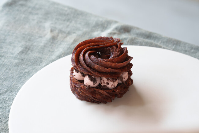 有機ココアを練りこんだクルーラー生地にカシスを入れたバタークリームと有機チョコレートをトッピング。