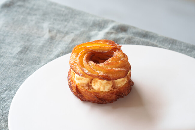 こだわりの平飼い卵が濃厚なクルーラー生地に、りんごとカスタードを組み合わせたバタークリームをサンド。