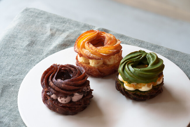 そのほか、りんごとカスタードのバタークリームをサンドした「アップルカスタード クルーラー」、京都産宇治抹茶を練りこんだクルーラー生地に、カマンベールを利かせたバタークリームと柚子ジャムを合わせた「柚子カマンベール クルーラー」をご用意いたしました。