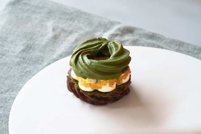 京都産宇治抹茶を練りこんだクルーラー生地にカマンベールを利かせたバタークリームと柚子ジャムを合わせました。