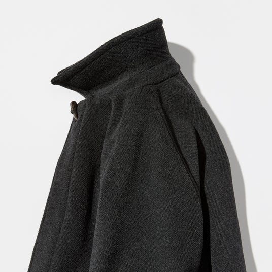 定番のステンカラーコートのモデルに、〈INVERTERE〉社のアイコンでもあるダッフルコートの本水牛のトグルボタンに上質なレザー紐をつけた別注モデル。