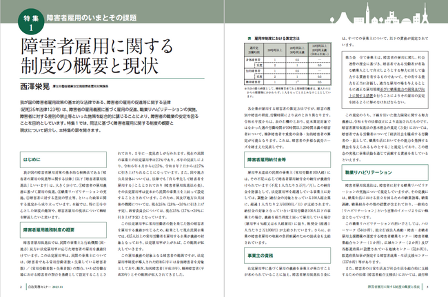 本特集では、国、自治体、民間企業等における障害者雇用の現状を分析し、今後さらに高まっていくと考えられる障害者の就労ニーズに応え、雇用の充実を目指すために、現在の課題を明確にします。