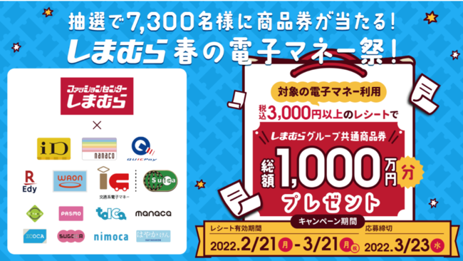 株式会社ジェーシービー (本社:東京都港区、代表取締役会長兼執行役員社長:浜川 一郎、以下JCB)は、2022年2月21日(月)から3月21日(月・祝)まで、電子マネー推進検討会のキャンペーン「抽選で7,300名様に商品券が当たる!しまむら春の電子マネー祭!」に参画します。