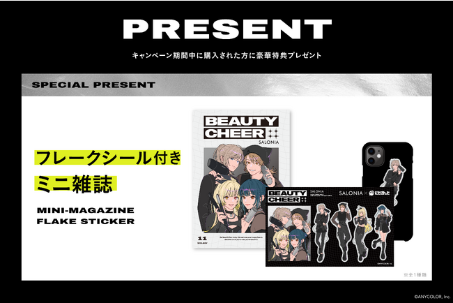 美容に興味はあるけど、なかなか一歩踏み出せない、そんな方へ。"きれいになりたい気持ち"を人気ライバーとともに応援します。専用ページより対象の商品をご購入いただいた方に、イラストレーターOKADAさんによる書下ろしイラストデザインの「フレークシール付きミニ雑誌」をプレゼント。ここでしか手に入らない、SALONIAアイテムを持ったにじさんじライバー達が描かれた特別デザインです。
