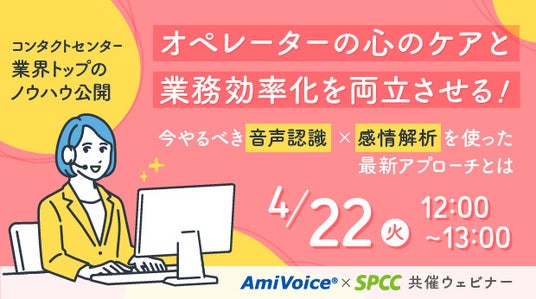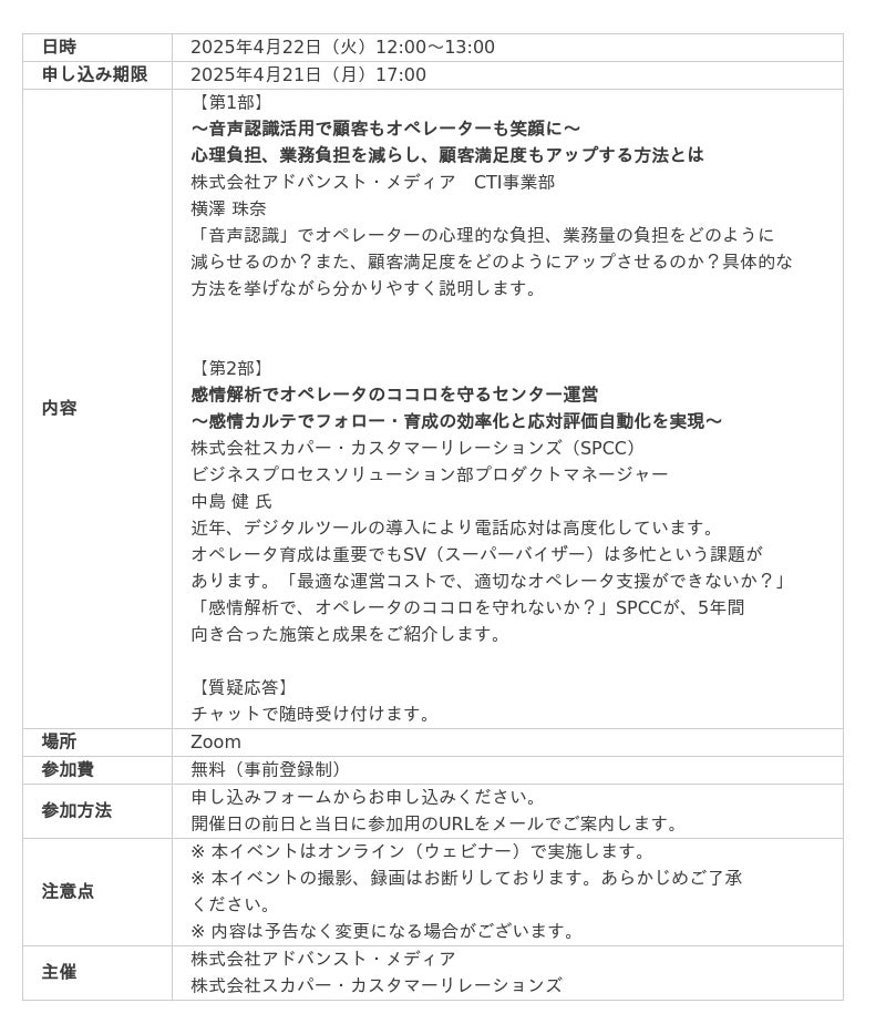 2025年4月22日(火)、株式会社アドバンスト・メディア(本社:東京都豊島区、代表取締役会長兼社長:鈴木清幸 以下、アドバンスト・メディア)は、アドバンストメディア×スカパー・カスタマーリレーションズ(SPCC)オンラインセミナー「【コンタクトセンター業界トップのノウハウ公開!】オペレーターの心のケアと業務効率化を両立させる!今やるべき音声認識×感情解析を使った最新アプローチとは」を共催いたします。