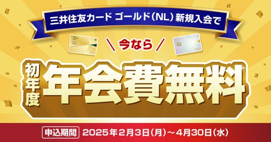 三井住友カード株式会社(本社:東京都江東区、代表取締役社長:大西 幸彦、以下:三井住友カード)は、2025年2月3日(月)より三井住友カード ゴールド(NL)初年度年会費無料キャンペーンを実施いたします。2025年2月3日(月)~2025年4月30日(水)の期間中に、三井住友カード ゴールド(NL)をお申し込みすると初年度の年会費が無料となります。
