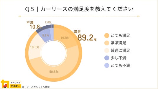 その結果、「ほぼ満足」が50.8%で半数を超え、続く「とても満足」の19.9%と「普通に満足」の18.5%を合わせると、89.2%の方がカーリースに満足していることがわかりました。