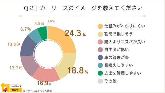Q1で「知っている(利用経験なし)」と回答した方にカーリースのイメージについて聞いたところ、「仕組みがわかりにくい」が24.3%で最も多く、次いで「割高で損しそう」が18.8%という結果となりました。