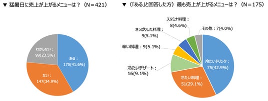 さらに、具体的に最も売上が上がるメニューのジャンルを聞いたところ、最も多かったのは「冷たいドリンク」(42.9%)、続いて「冷たい料理」(29.1%)で、「冷たいデザート」(9.1%)、「辛い料理」(5.1%)など他のジャンルよりも売上が上がることが明らかになりました。