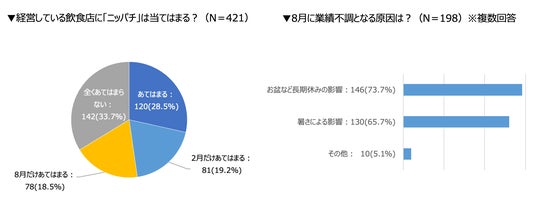 まず、飲食店運営にあたり「ニッパチ」があてはまるかについて聞いたところ、「あてはまる(2月・8月に業績が下がる)」(28.5%)、「2月だけあてはまる」(19.2%)、「8月だけあてはまる」(18.5%)、「全くあてはまらない」(33.7%)と、という結果になりました。