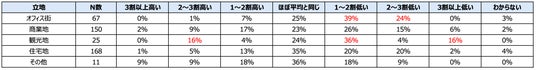 また、8月と年間月平均売上との比較について立地別に見てみると、オフィス街は売上が下がる割合が高く、観光地は場所によって二極化するという傾向が見られました。お盆など長期休みの影響が出ていると考えられます。