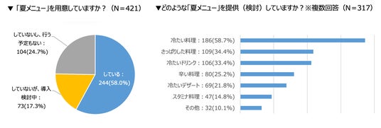 さらに、具体的にどのような「夏メニュー」を提供(検討)しているか聞いたところ、最も多かったのが「冷たい料理」(58.7%)で、「辛い料理」(25.2%)や「スタミナ料理」(14.8%)よりも2倍以上提供(検討)されていることがわかりました。