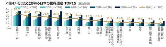 行ったことがある世界遺産も「原爆ドーム」(36.7%)がTOP。「厳島神社」「古都京都の文化財」「法隆寺地域の仏教建造物」「日光の社寺」「古都奈良の文化財」「姫路城」が2割台で続く。