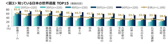 年代が上がるほど、世界遺産であることを知っている割合も高くなる。<図3>