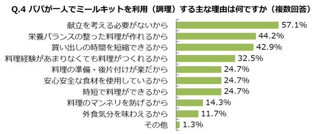 コロナ禍においてパパがミールキットを調理する機会が増えた人にその理由を聞いたところ、「献立を考える必要がない」「栄養バランスの整った料理が作れる」といった理由に高い支持が得られました(Q.4参照)。