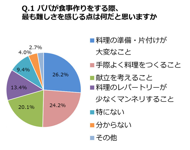 その一方で、パパは料理に対して、準備や片付けに手間がかかることや手際のよさに難しさを感じていることが明らかになりました(Q.1参照)。その他にも予算内で買い物をすることの難しさやパパが食事をつくるとカロリーが高くなってしまうとの声もあがるなど、さままな点で難しさがあることがわかりました。