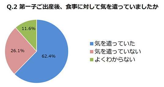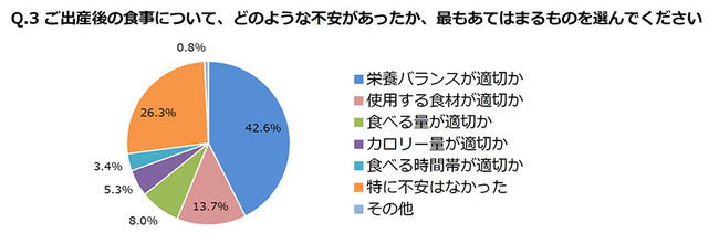 産後は半数以上のママが食事に気を使っていて、特に栄養バランスのよい食事がとれているかという点に対する不安が大きいことがわかりました。
