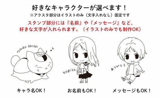 スタンプ部分のテキストは、キャラクター名はもちろん、自分の名前や好きなメッセージを入れることも。お好みにあわせて、テキストを入れずにイラストのみで作ることもできます。