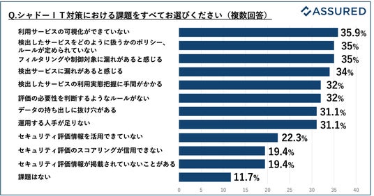 加えてシャドーIT対策を実施している企業のうち、約9割が課題を抱えていることが分かりました。具体的には、「利用サービスの可視化ができていない」(35.9%)「検出したサービスをどのように扱うかのポリシー、ルールが定められていない」(35%)「フィルタリングや制御対象に漏れがあると感じる」(35%)「検出サービスに漏れがあると感じる」(34%)などが挙げられています。検出後の対応が定まっていないケースや、検出対象の網羅性に懸念があることが多いようです。