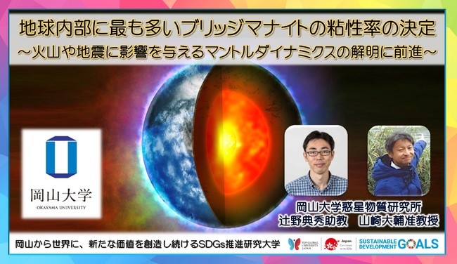 国立大学法人岡山大学(本部:岡山市北区津島中、学長:槇野博史)惑星物質研究所の辻野典秀助教、山崎大輔准教授、芳野極教授と愛媛大学地球深部ダイナミクス研究センターの西原遊教授、公益財団法人高輝度光科学研究センター(JASRI)の肥後祐司主幹研究員、丹下慶範主幹研究員の共同研究グループは、地球内部で最も多く存在する下部マントルの最主要鉱物であるブリッジマナイト多結晶体の粘性率を、高温高圧下条件下での変形実験によって決定しました。