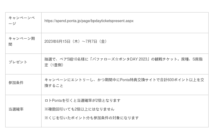 また、このたびの開催を記念し、2023年6月15日(木)~7月7日(金)の期間中に、キャンペーンページからエントリーし、参加条件を満たした方の中から抽選で、ペア5組10名様に「バファローズ☆ポンタDAY 2023」観戦チケットをプレゼントいたします。