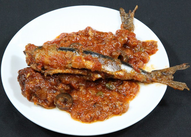 新鮮なイワシを、太陽のトマト麺特製のトマトソースでじっくりと柔らかくなるまで煮込みました。