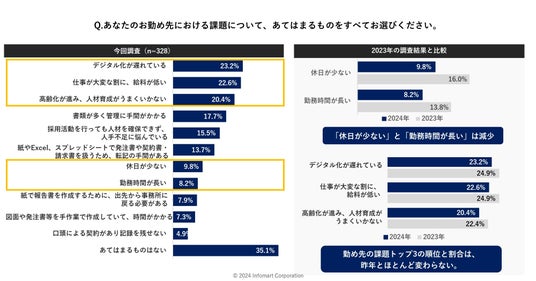 勤め先の課題について聞いたところ(n=328)、「勤務時間が長い」「休日が少ない」が、2023年の調査時よりも減少しており、昨年と比べて働き方改革が進んでいると言えます。一方で、「デジタル化が遅れている」は23.2%、「仕事が大変な割に、給料が低い」は22.6%、「高齢化が進み、人材育成がうまくいかない」は20.4%となり、昨年と同様に上位を占める結果となりました。