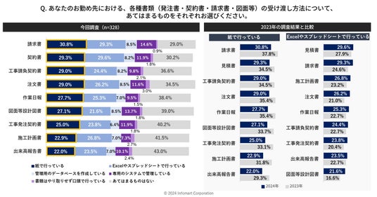 - 各種書類(発注書・契約書・請求書・図面等)の受け渡し方法、昨年調査時から「紙」が減少するも、「Excelやスプレッドシート」が増加傾向に